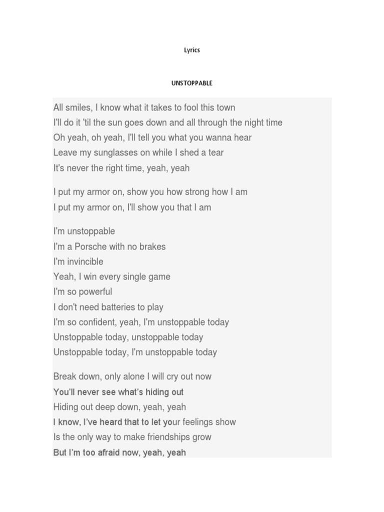 5 / 5 687 мнений. I'll smile, i know what it takes to fool this town i'll do it 'til the sun goes down and all through the night time, oh yeah, oh, yeah i'm unstoppable i'm a porsche with no brakes i'm invincible yeah, i win every single game i'm so powerful i don't need batteries to play i'm so confident. All smiles, i know what it takes to fool this town i'll do it 'til the sun goes down and all through the night time, oh yeah i put my armor on show you how strong i am i put my armor on i'll show you that i am. All smiles, i know what it takes to fool this town i'll do it 'til the sun goes down and all through the night time oh yeah oh yeah, i'll te. Unstoppable is an empowerment anthem which beat builds as the song progresses.